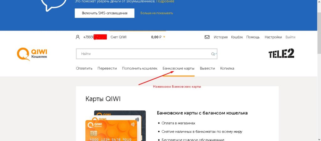 Авторизовываемся в кошельке Qiwi и нажимаем на вкладку "Банковские карты".