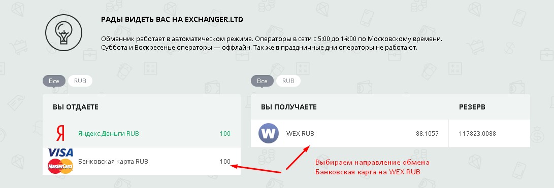 Откройте направление обмена "Банковская карта — Wex RUR"