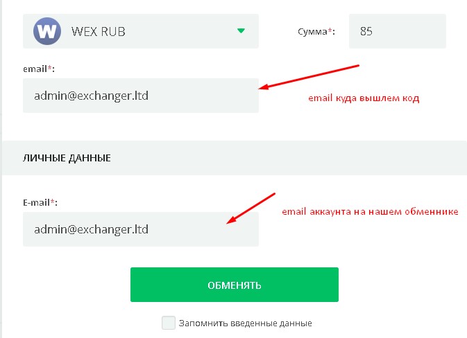 Заполните поле email, туда отправится код Wex, так же код вы увидите на странице обмена, после оплаты.